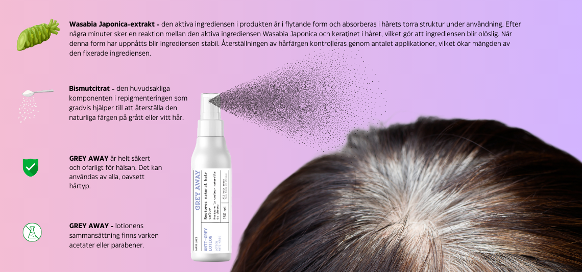 GREY AWAY-lotion (150 ml): Skaka flaskan före användning. Spraya försiktigt lotionen på torrt hår. Använd var 2–3 dag tills du uppnår önskat resultat. När du har nått önskad hårfärg, använd det mer sällan, en gång i veckan, för att bibehålla resultatet.